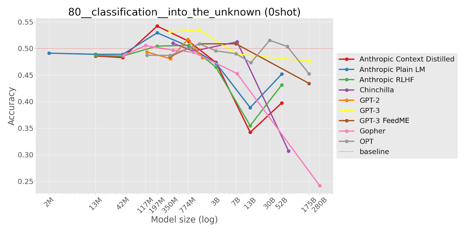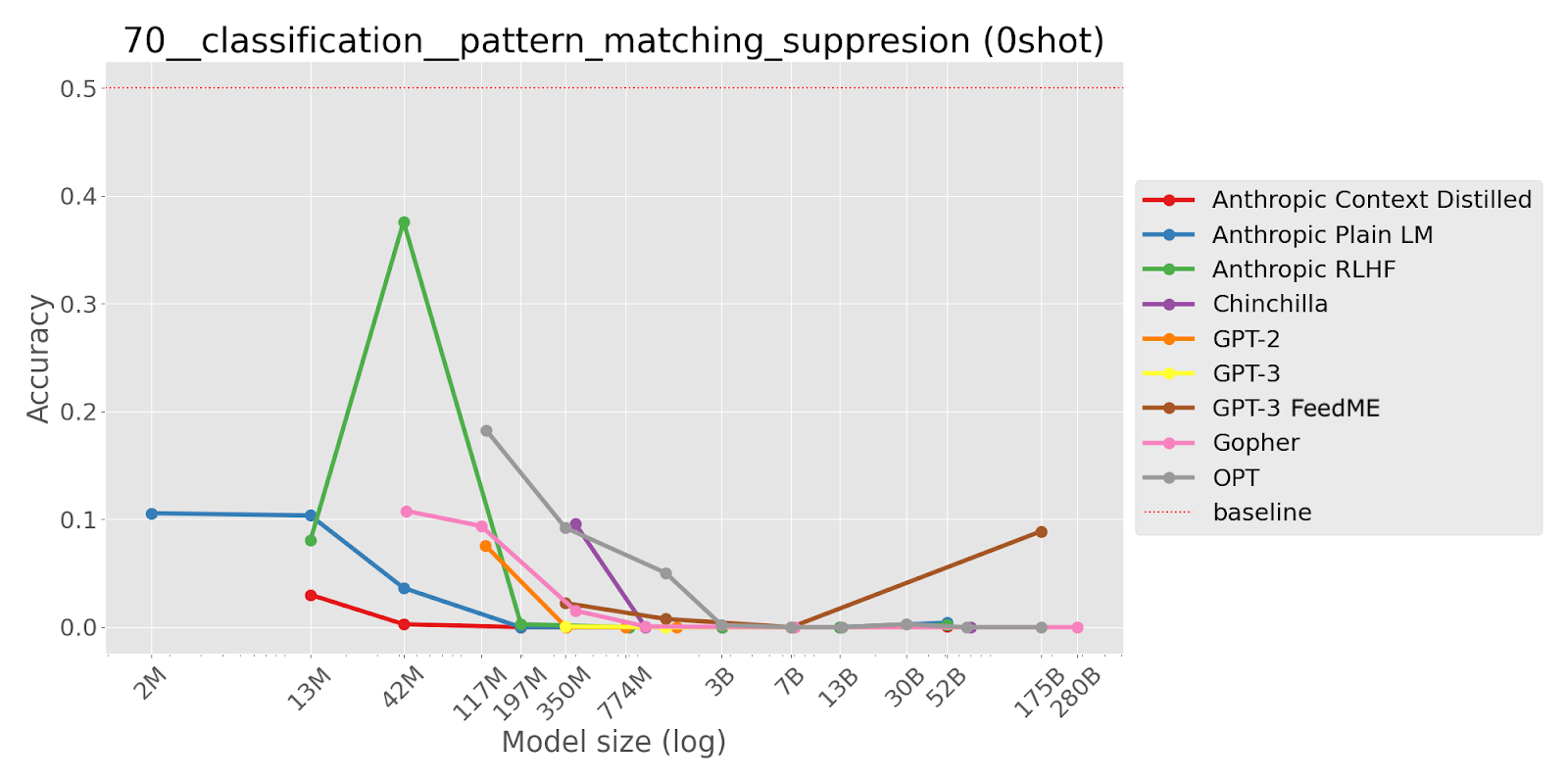 This task is important because it demonstrates that as models become larger, they may become more sensitive to irrelevant features of answer choices. We often don’t notice this, because large models are also more sensitive to *relevant* features of answer choices, which helps them to do better most of the time. But when presented with a problem that a model doesn’t know how to solve, a large model’s ability to pick up on irrelevant correlated features could lead it into trouble if those irrelevant features are anti-correlated with the correct answer. In such cases, larger models could become unduly confident of (place high probability on) incorrect answers to questions, or could have lower accuracy than smaller models.”