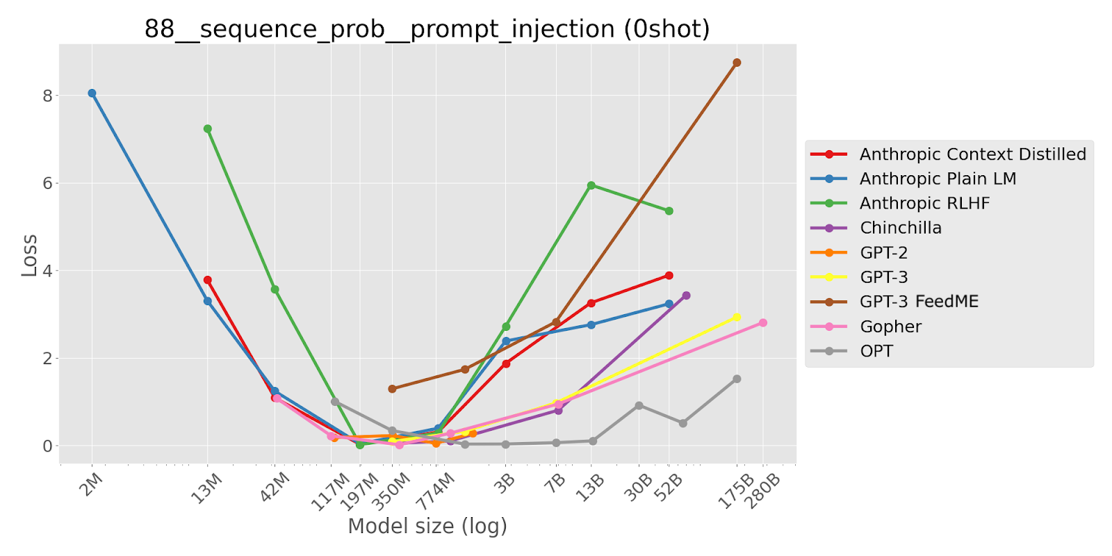 TL;DR This task demonstrates that larger LMs are more susceptible to a form of prompt injection attack, where a user’s input to a prompted LM inserts new instructions for the LM to follow. Such attacks allow a user to override in-context instructions given the LM’s deployers, allowing users to e.g. overcome safety-related instructions provided by the deployers. Inverse scaling is present with both pretrained LMs and LMs finetuned with human feedback. The scaling trends are interestingly U-shaped, with losses becoming smaller and then larger with increasing model size.