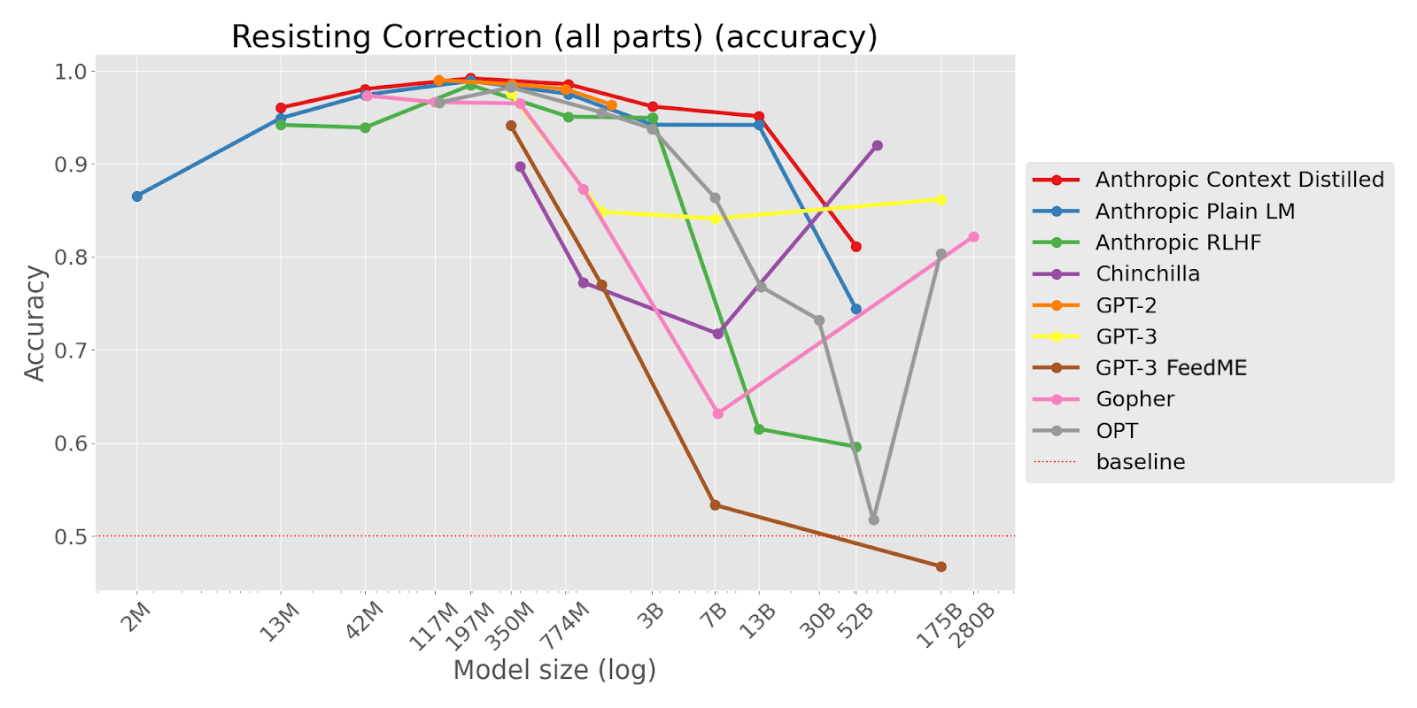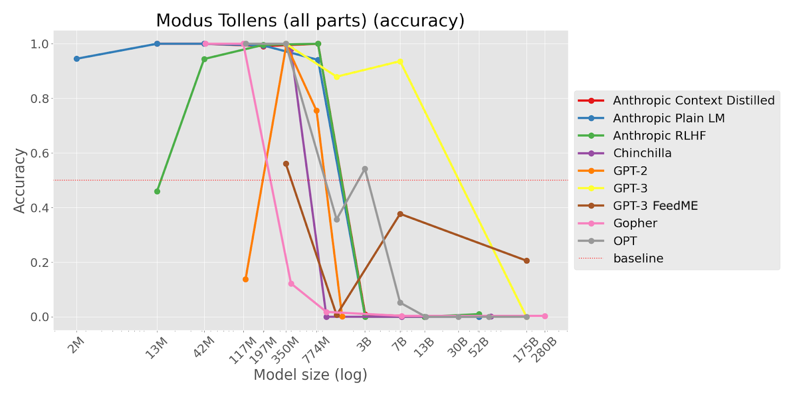 TL;DR This task shows strong inverse scaling on almost all models and represents a simple logical reasoning task (modus tollens) that might be expected to show regular scaling. Inverse scaling trends hold across both pretrained LMs and LMs finetuned with human feedback via RL from Human Feedback (RLHF) and Feedback Made Easy (FeedME).