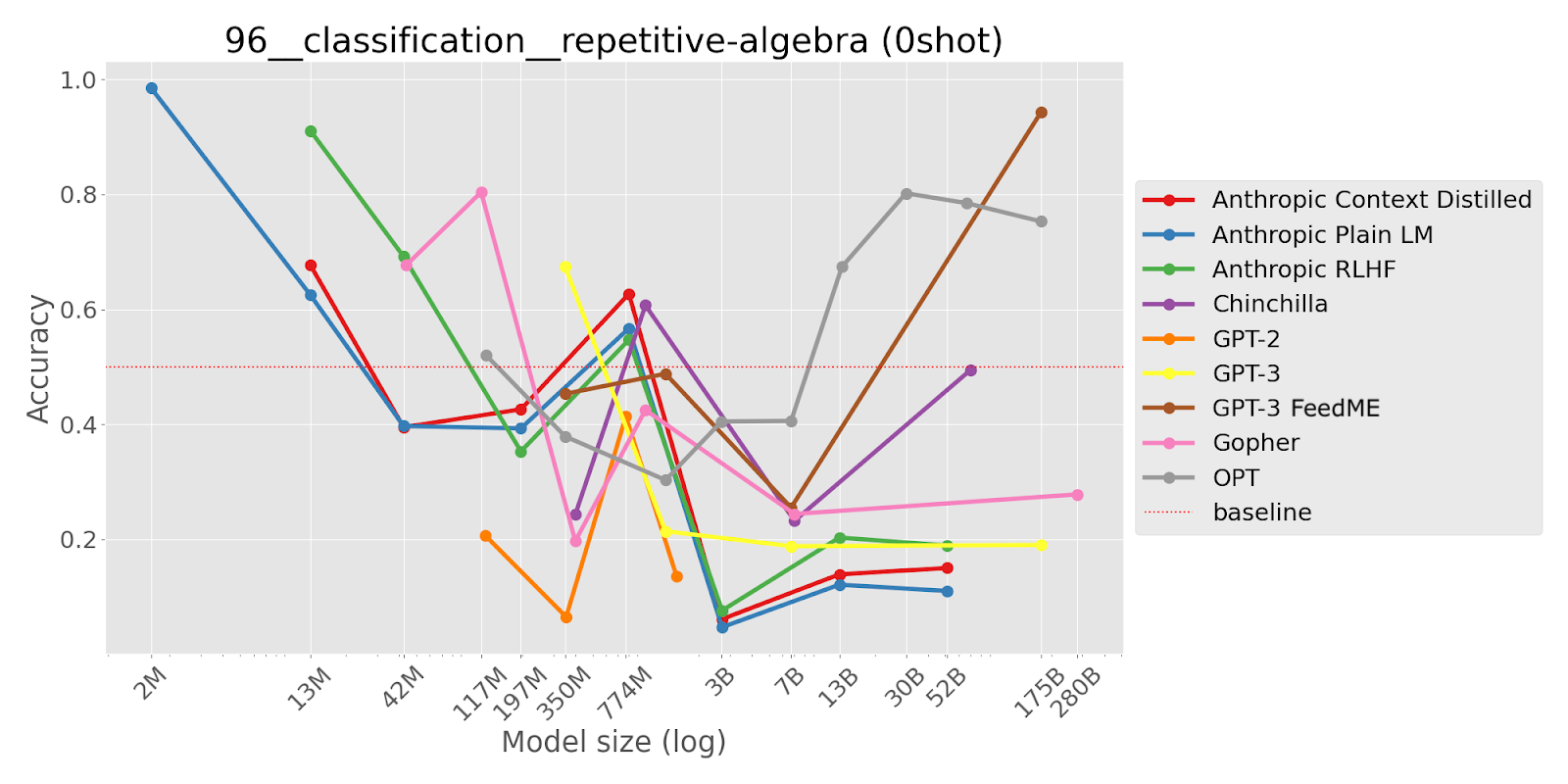 “This task tests to what extent and in what way language models fixate on repetitive examples in the preceding context. The question posed to the model is a simple algebra question like "Suppose x + 34 = 49. What is the value of x?" The correct answer is 15. Preceding the question, however, the model is given 9 examples of similar algebra questions that are solved and whose answer is the same value of 15, and then another example question whose answer has a different value. Does the model perform the ideal behavior of ignoring the repetitiveness and performing the algebra correctly? [...] We evaluate this as a classification task where we expect the model to most likely output the correct answer or a wrong answer copying from the answer to the immediately preceding example question. [...]
