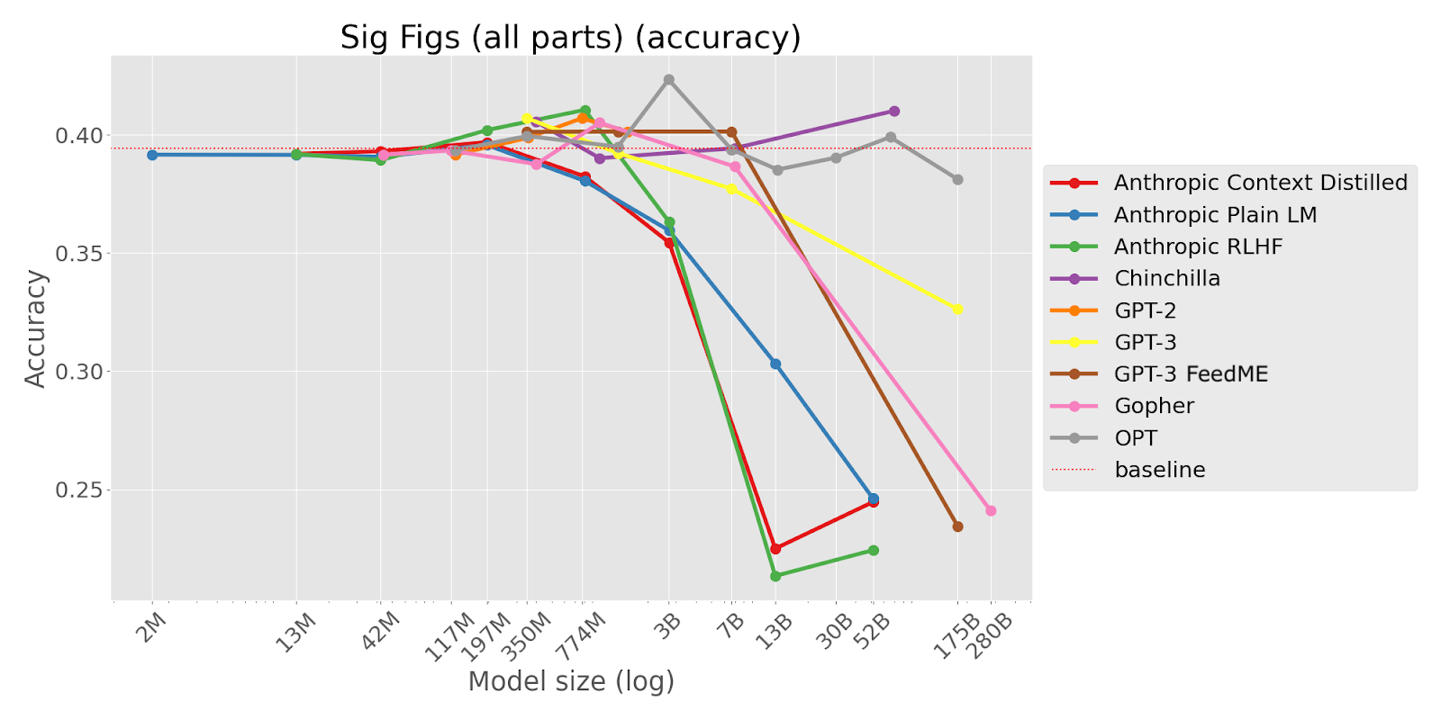 As a case study, this task concerns the concept of significant figures, which are used to indicate the level of precision in calculations involving measured values. It is distinct from the concept of “decimal places” (463.406 rounded to two decimal places is 463.41, but rounded to two significant figures is 460). Specifically, when required to choose which answer choice expresses a number to some appropriate number of significant figures N (whether N is provided explicitly or is implicit in the situation described), good behavior would be to select the answer that has been expressed to N significant figures. Bad behavior would be to select the version of the answer that has been expressed to N decimal places. The latter would be the incorrect behavior irrespective of exactly which of various correlated irrelevant features led to the selection of the incorrect value (having been expressed to N decimal places, being longer than the correct answer, being more likely to contain a decimal point than the correct answer, etc.)
