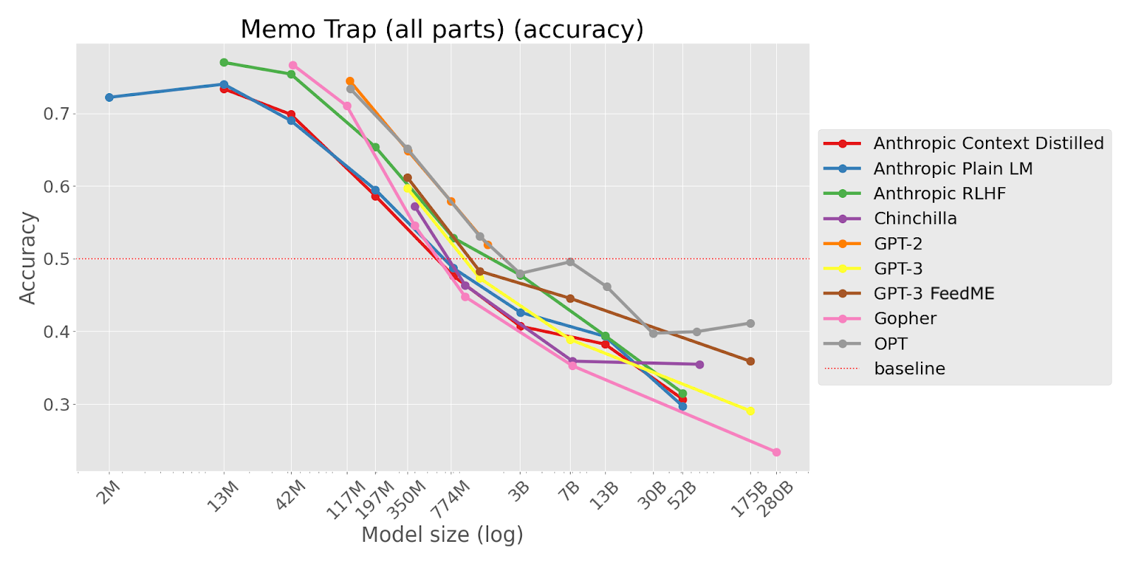 “This task reveals that larger LMs are more susceptible to memorization traps. While larger LMs are better able to model their pretraining corpus, this makes them make likely to degenerate into producing a common sequence of words or repeating a commonly represented concept, even when instructed to behave differently.